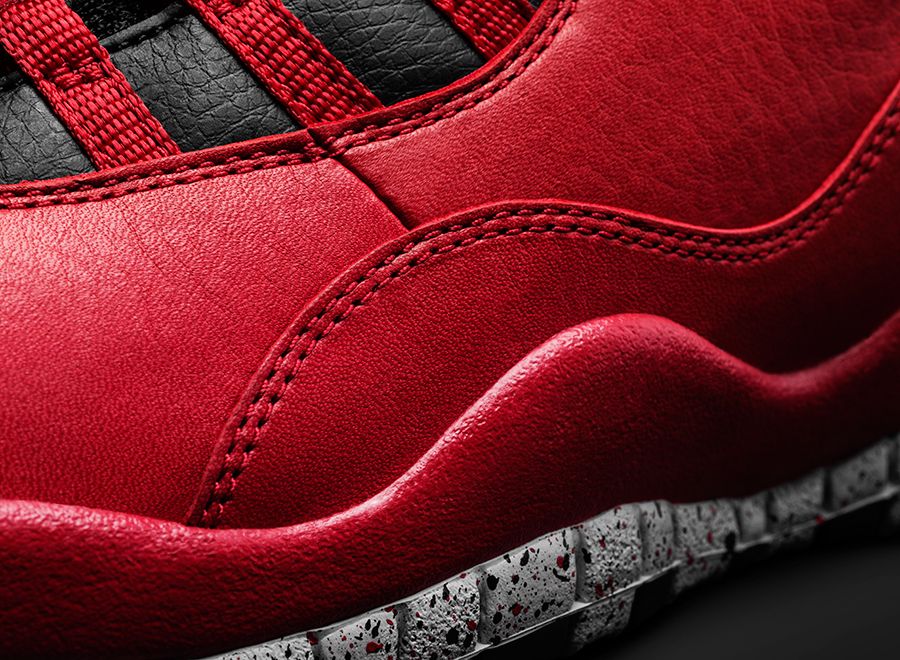 This upcoming Air Jordan 10 Retro “Bulls Over Broadway” 2015 features a premium Red leather base, with Black and Grey detailing throughout finished with a speckled/cement printed outsole.